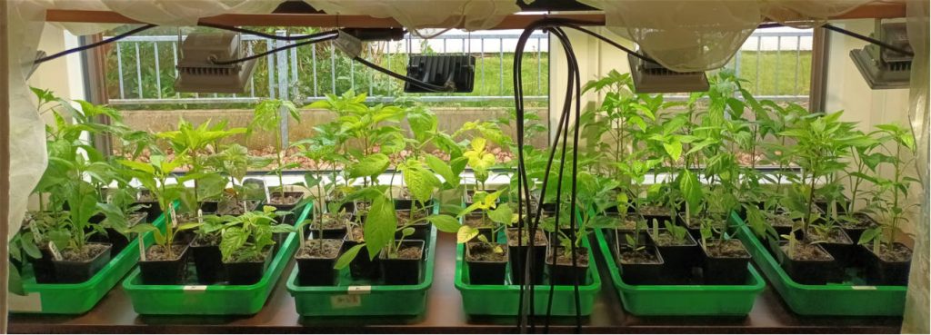 Auf der Fensterbank stehen die größeren Chilis. In drei Wannen stehen die Chilis meiner Frau, in zwei Wannen meine und in einer Wanne Chilis zum Verschenken.