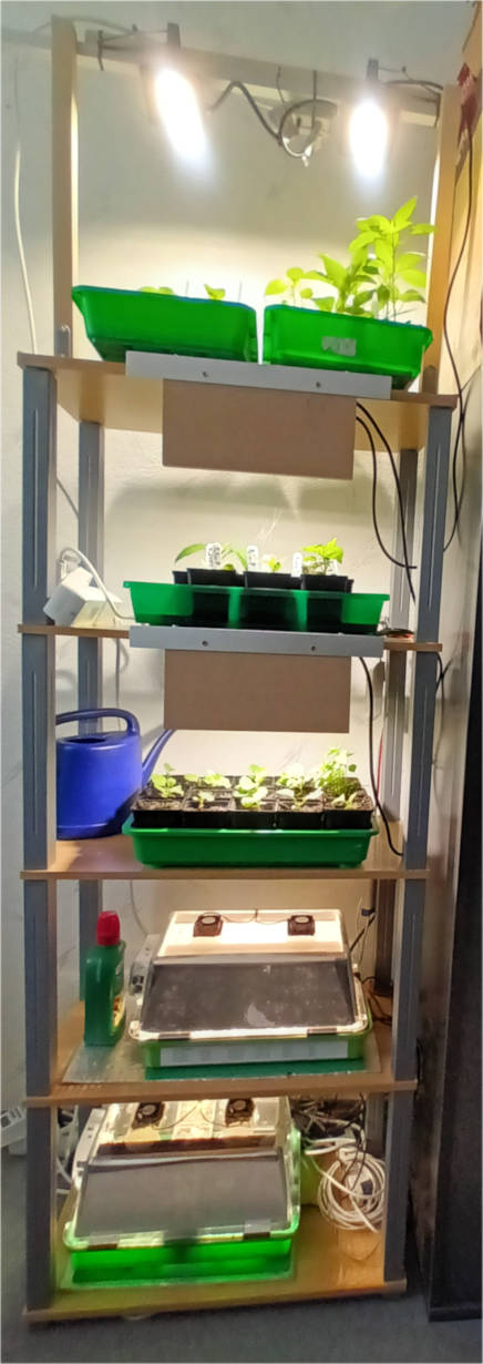 Im Regal von oben nach unten: Chilis zum Verschenken, kleine Chilis für mich, Auberginen meiner Frau, frisch ausgesäte Tomatensamen und Basilikums meiner Frau.