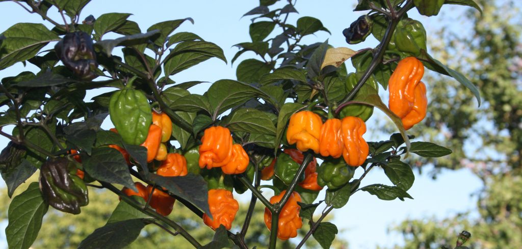 Generell sind Habaneros, wie Kathumby Yellow, eher gedrungen im Wuchs und haben recht große Blätter.