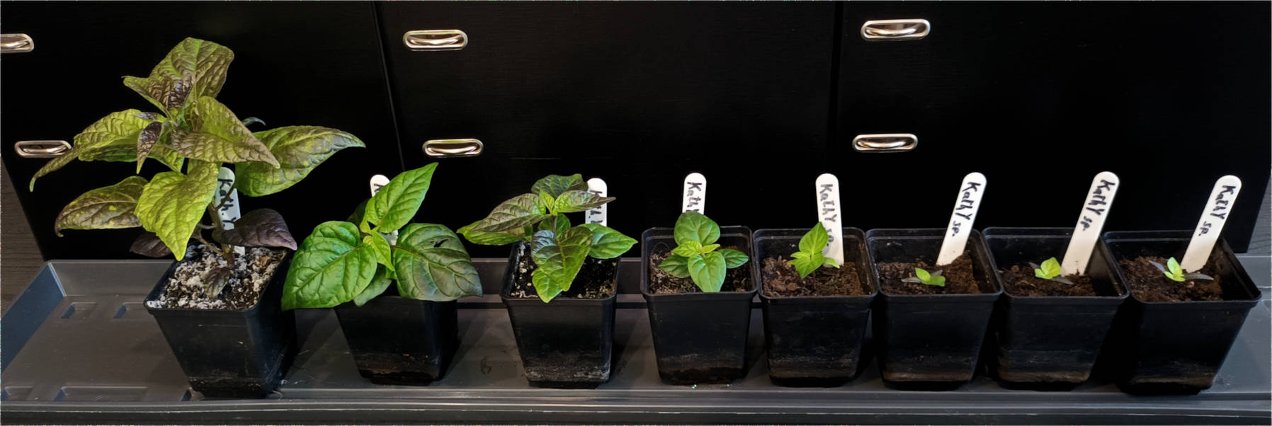 Die Kathumbys liegen mir dieses Jahr besonders am Herzen und nun sind sie nicht mehr zu sehen, weil sie wegen ihrer kleinen Größe im Chiliregal stehen. Das folgende Foto mit allen Kathumbys aus dieser Saison wurde bewusst etwas zu dunkel gehalten, um wenigstens ein wenig die dunkle Schattierung der Blätter erkennen zu können, die in Wirklichkeit deutlicher zu sehen ist.