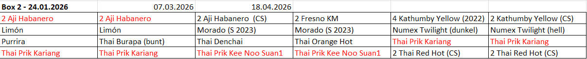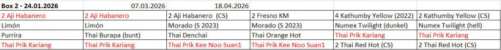 Kathumby Yellow: Im Internet hatte ich keinen Kathumby Yellow gefunden, der so hübsch war, wie der, den ich 2016 von Semillas gekauft hatte. Ich habe nun einen bestellt, der zumindest große Ähnlichkeit damit haben müsste und ich werde ihn in der zweiten Anzuchtbox einsetzen. Parallel dazu habe ich noch zwei überwinterte Pflanzen aus 2025, die in diesem Jahr hoffentlich reife Früchte bilden! – Am 15.01.2026 hatte ich noch einige alte Samen aus 2022 gefunden, die fälschlicherweise bei 2025 einsortiert waren. Davon habe ich 10 eingeweicht und werde davon 4 in die Box 2 setzen. Die restlichen 6 weichen weiterhin ein und werden dann in die Box 3 gesetzt.