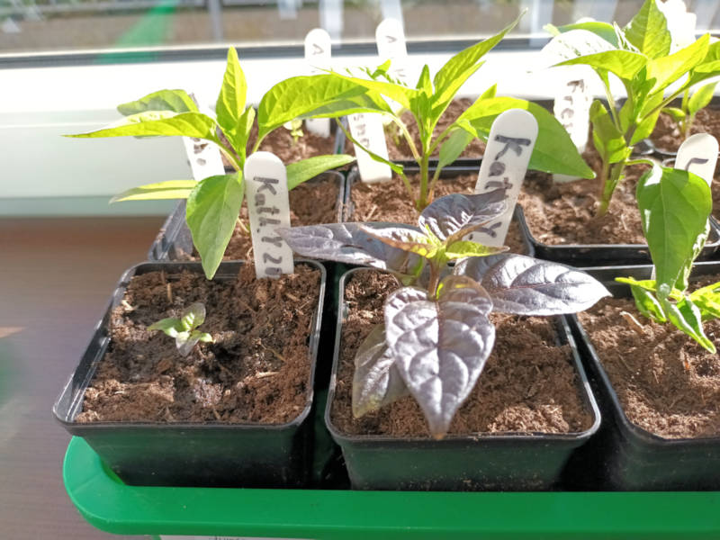Nach einer Woche sichtbar: 2 Fresno KM, 1 Georgia Flame, 1 Morado, 1 Nepalese Bell, 1 Numex Twilight (dunkel), 1 Numex Twilight (hell), 2 Purrira, 2 Thai Burapa (bunt), 2 Thai Denchai, 1 Thai Orange Hot, 3 Thai Red Hot (CS), 1 Zébrange.