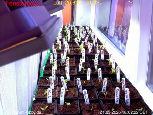 Des Weiteren gibt es in meinem Mini-Gewächshaus noch eine Webcam mit Temperaturfühlern, deren Konfiguration jedes Jahr etwas angepasst wird, damit die Fotos in den richtigen Ordner meiner Webseite hochgeladen werden. Das rechte Foto zeigt erste Keimlinge und stammt von einer solchen WebCam.
