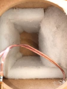 Am nächsten Tag: Wer die Weiche selber plant, bekommt nun besonders viel Arbeit! Auf die Rückwand wird eingezeichnet, wo der Ausschnitt für das Anschlussterminal sitzen soll. In diesem Kreis, aber deutlich außerhalb der Mitte, bohrt man nun bei einem Gehäuse ein Loch, um alle Kabel der verschiedenen Chassis herausführen zu können. Bei vier Lautsprecherkabeln habe ich mit 10 mm gebohrt. Außerdem wurde ein 6 mm Loch in die Unterseite des Mitteltönerabteils gebohrt, ein entsprechendes Kabel durchgeführt, passend abgeschnitten (mindestens 10 cm länger lassen, als unbedingt nötig) und das gebohrte Loch mit Holzkleber beidseitig dicht verklebt. Wer eine fertige Weiche nutzt, kann sich die nachfolgenden Weichenoptimierungen sparen. Diese können durchaus mehrere Tage dauern und kostet reichlich Nerven, bringen aber am Ende hoffentlich ein Erfolgserlebnis! Kurze Einführung dazu hier!