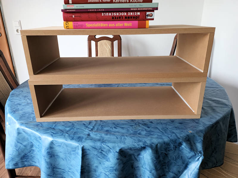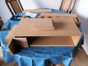 Für eine verbesserte Verklebung der Frontplatte wurden vorne noch zwei seitliche Leisten eingebracht (ohne Foto), die nun mit je einer Seitenwand, aber nicht mit der Frontplatte verklebt wurden. Damit der Kleber die Seitenleisten beim Trocknen nicht schräg hochzieht, wird die Rückwand als Gewicht hochkant auf beide Seitenleisten gestellt.