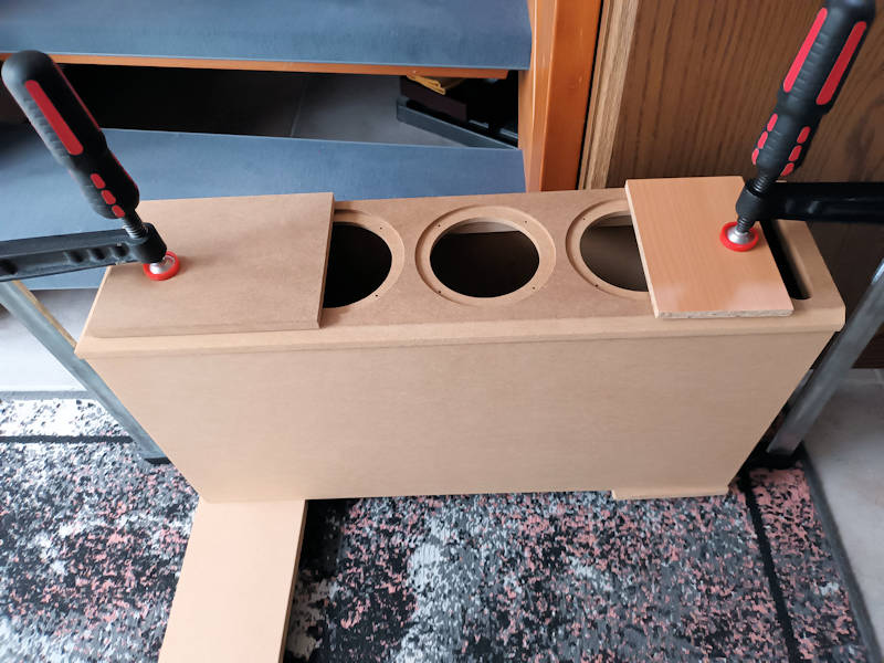 Nach der Trocknung des Klebers wird nun die Front verklebt. Dazu zieht man mit der Kleberkartusche einen durchgehenden Streifen mit Kleber entlang der Innenseiten der außenliegenden Bretter, damit möglichst kein Kleber nach außen dringt. Der müsste sonst sofort mit einem leicht feuchten Tuch abgewischt werden! – Auch auf die Innenbretter und die Seitenleisten werden solche Kleberstreifen gegeben. Dann wird die Front passend auf das Gehäuse gelegt und leicht angedrückt, wobei die Frontplatte gerne in irgendwelche Richtungen driftet. Die Front sollte absolut mittig aufliegen, wobei es in meinem Fall wichtig war, dass auch die Bassreflexöffnung mittig lag. Leider hatte ich einen kleinen Fehler in meiner Berechnung der Front, so dass dabei die Front oben 2 mm mehr herausragte, als geplant (1 mm). Aber es gibt Schlimmeres! Wegen meiner „Fertigungstoleranzen beim privaten Lautsprecherbau“ plane ich die Front generell 2 mm breiter und höher, als das restliche Gehäuse, besonders dann, wenn ein Furnier verwendet werden soll, wie auch hier. – Wie auch immer, die Front soll wirklich festsitzen und wird deshalb noch mit mindestens zwei Schraubzwingen fixiert. Auch hierbei verschiebt sich die Front sehr gerne. Also aufgepasst! (Die Chassis auf dem Foto bitte erst später einbauen und anschließen! Es war nur zu meiner Motivation und für den folgenden Weichentest! Die Zwinge war nur dazu da, um die eingelegte Rückwand am Herausfallen zu hindern.)