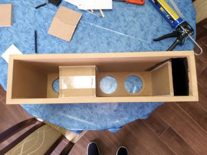 Am Folgetag, wenn die Farbe trocken ist, werden alle Innenbretter inklusive des gestrichenen Bassreflexbrettes (Innenteiler) eingeklebt. In meinem Fall gab es ein innenliegendes Fach für den Mitteltöner. Zukünftige Empfehlung: Wer so etwas baut, sollte die Bretter dafür so zusägen, dass das mittlere Brett, welches hinten aufliegt, tatsächlich aufliegt und nicht zwischen die zwei seitlichen Bretter gebracht werden muss, da Letzteres etwas umständlicher ist, sprich, vorübergehend mittels Klebestreifens fixiert werden muss. Auf dem Foto rechts (schöne Schuhe!