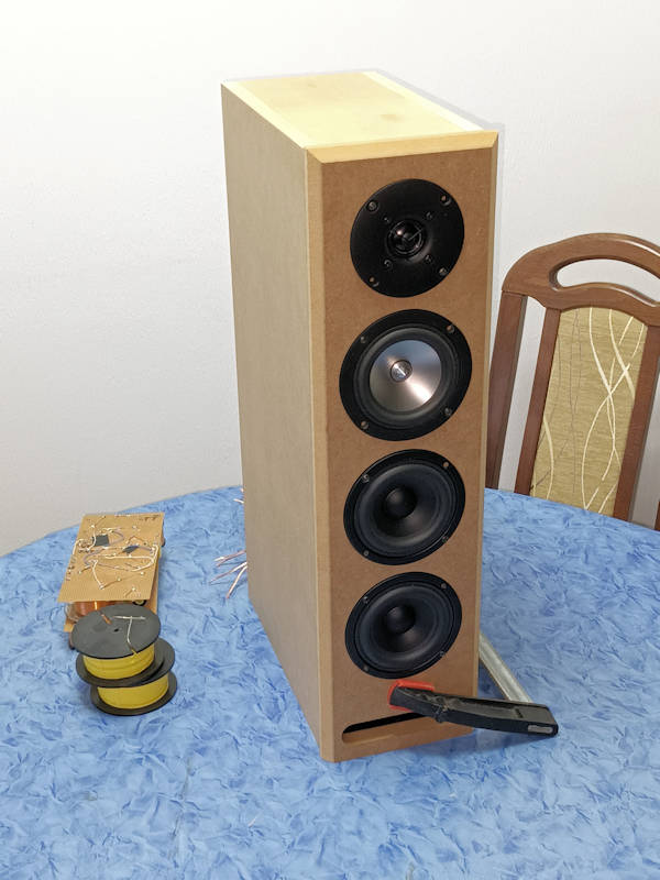 Am nächsten Tag: Wer die Weiche selber plant, bekommt nun besonders viel Arbeit! Auf die Rückwand wird eingezeichnet, wo der Ausschnitt für das Anschlussterminal sitzen soll. In diesem Kreis, aber deutlich außerhalb der Mitte, bohrt man nun bei einem Gehäuse ein Loch, um alle Kabel der verschiedenen Chassis herausführen zu können. Bei vier Lautsprecherkabeln habe ich mit 10 mm gebohrt. Außerdem wurde ein 6 mm Loch in die Unterseite des Mitteltönerabteils gebohrt, ein entsprechendes Kabel durchgeführt, passend abgeschnitten (mindestens 10 cm länger lassen, als unbedingt nötig) und das gebohrte Loch mit Holzkleber beidseitig dicht verklebt. Wer eine fertige Weiche nutzt, kann sich die nachfolgenden Weichenoptimierungen sparen. Diese können durchaus mehrere Tage dauern und kostet reichlich Nerven, bringen aber am Ende hoffentlich ein Erfolgserlebnis! Kurze Einführung dazu hier!