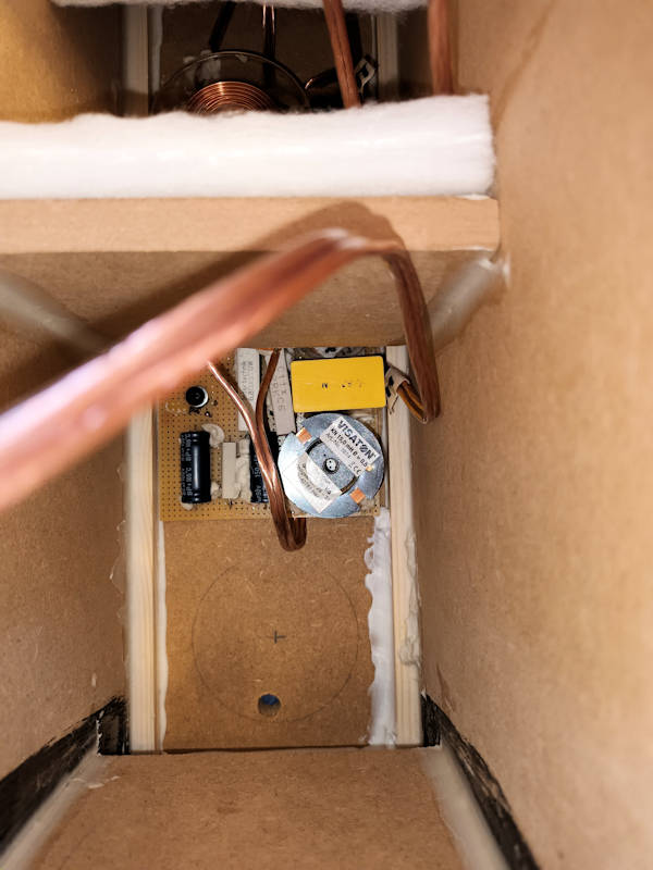 Wenn die Weiche optimiert ist, prüft man sie auf schlechte Lötstellen und Lötzinnreste und lötet alle Leitungen für die Chassis und das Terminal an. Anschließend fixiert man die Bauteile mittels des Holzklebers aus der Pistole, damit es bei größeren Lautstärken nicht zu unerwünschten Resonanzen kommt. Wenn der Kleber trocken ist, schraubt man die Weichen inklusive der angelöteten großen Spulen an eine sinnvolle Stelle auf die innenliegende Seite der Rückwand, wobei unbedingt genügend Platz für das Terminal bleiben muss! Ich habe daher den unteren Weichenrand bei 12 cm Abstand von der Gehäuseunterkante festgelegt! Da bei diesem allseitig verklebten Gehäuse keine Chance besteht, nachträglich die Weiche zu verändern, sollte alles rund um die Weiche mit äußerster Sorgfalt bedacht und ausgeführt werden!